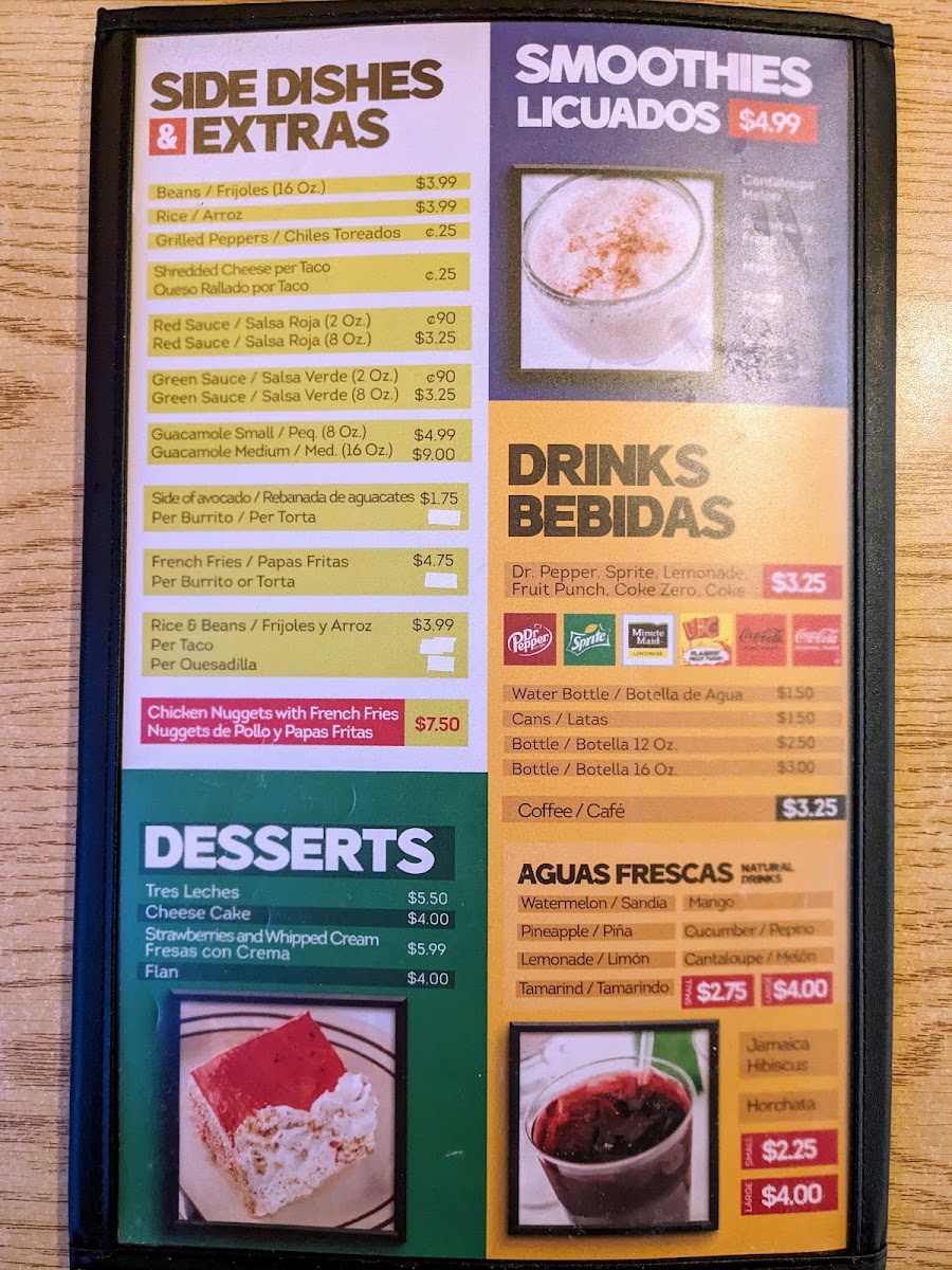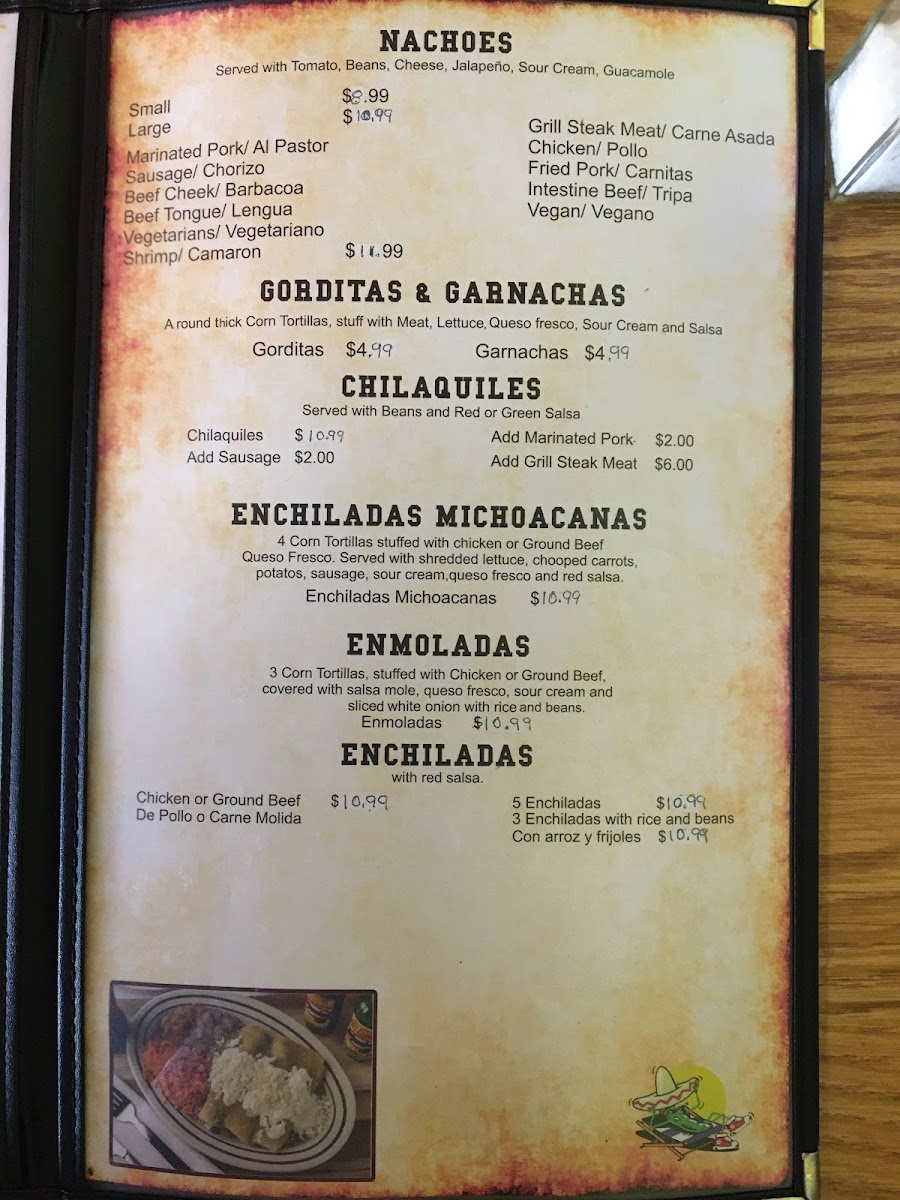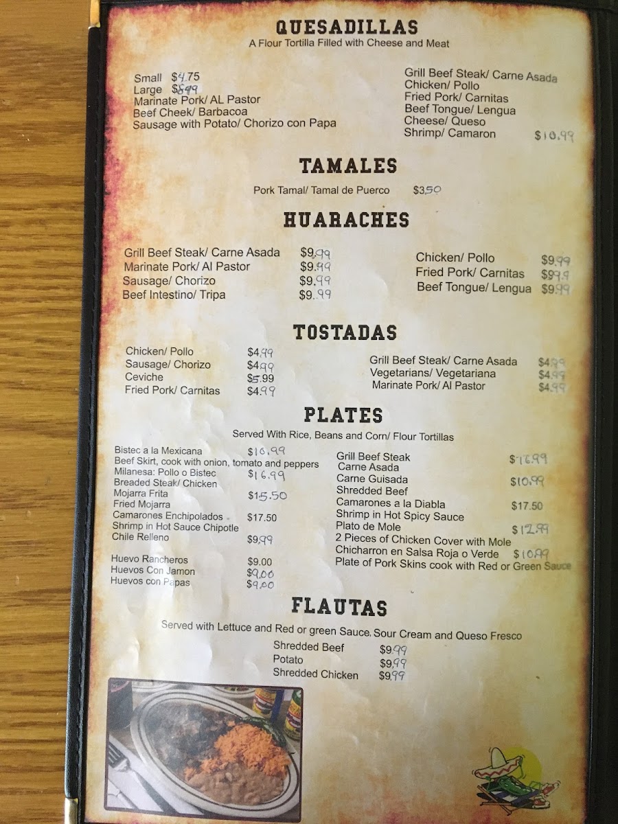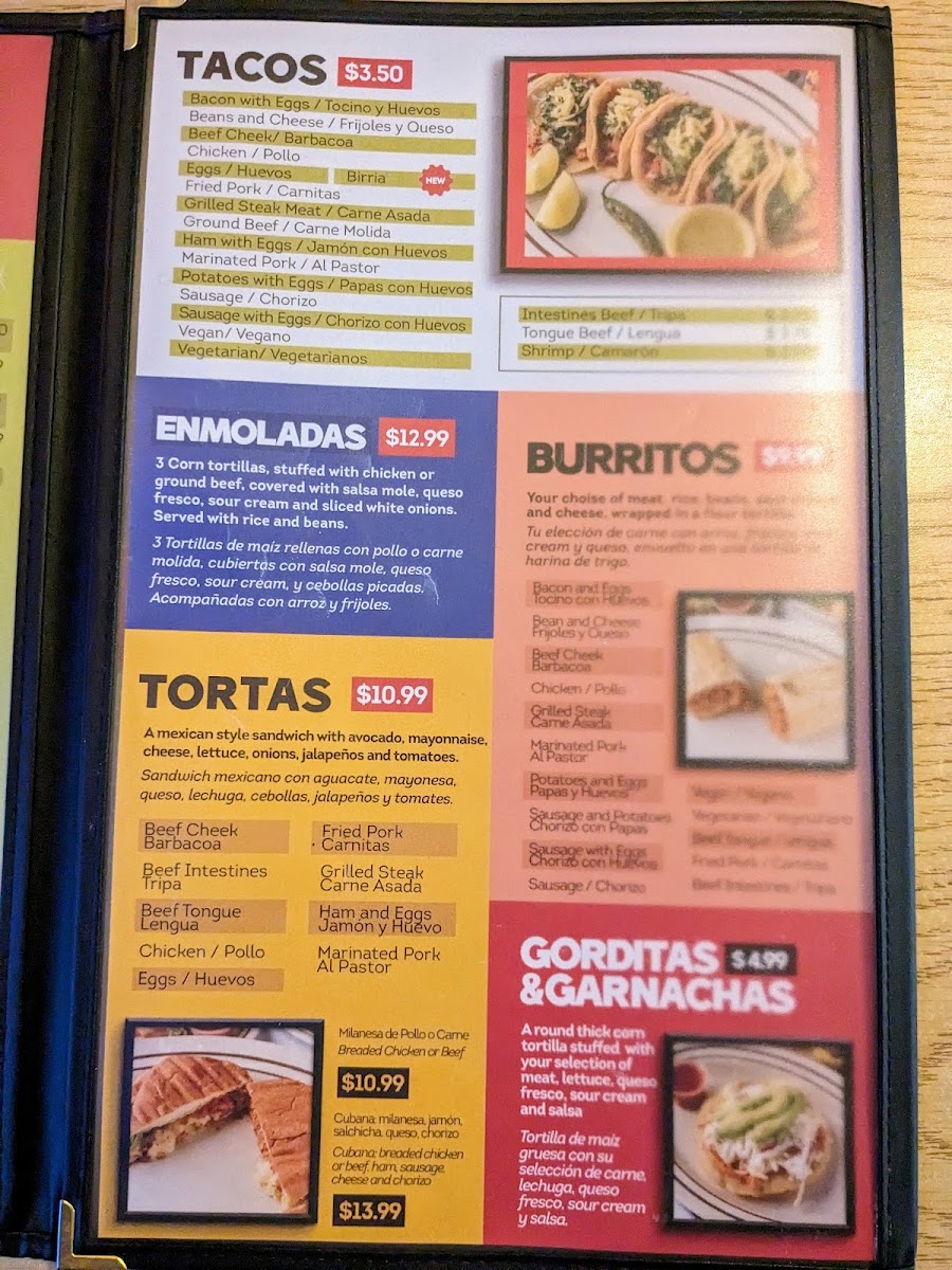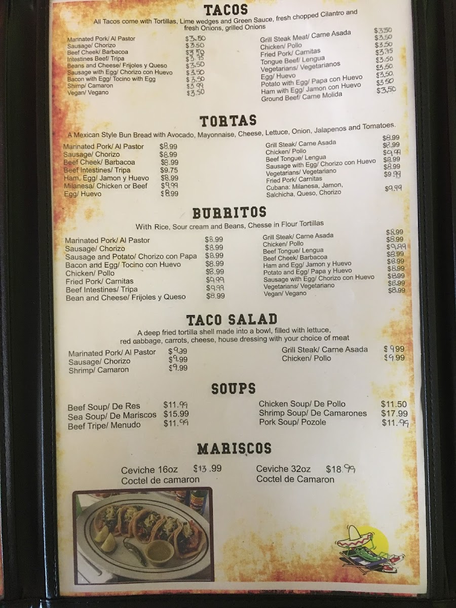 Al Pastor, Carne Asada, Chorizo, Pollo Carnitas, Barbacoa, Lengua, Tripas y Picadillo